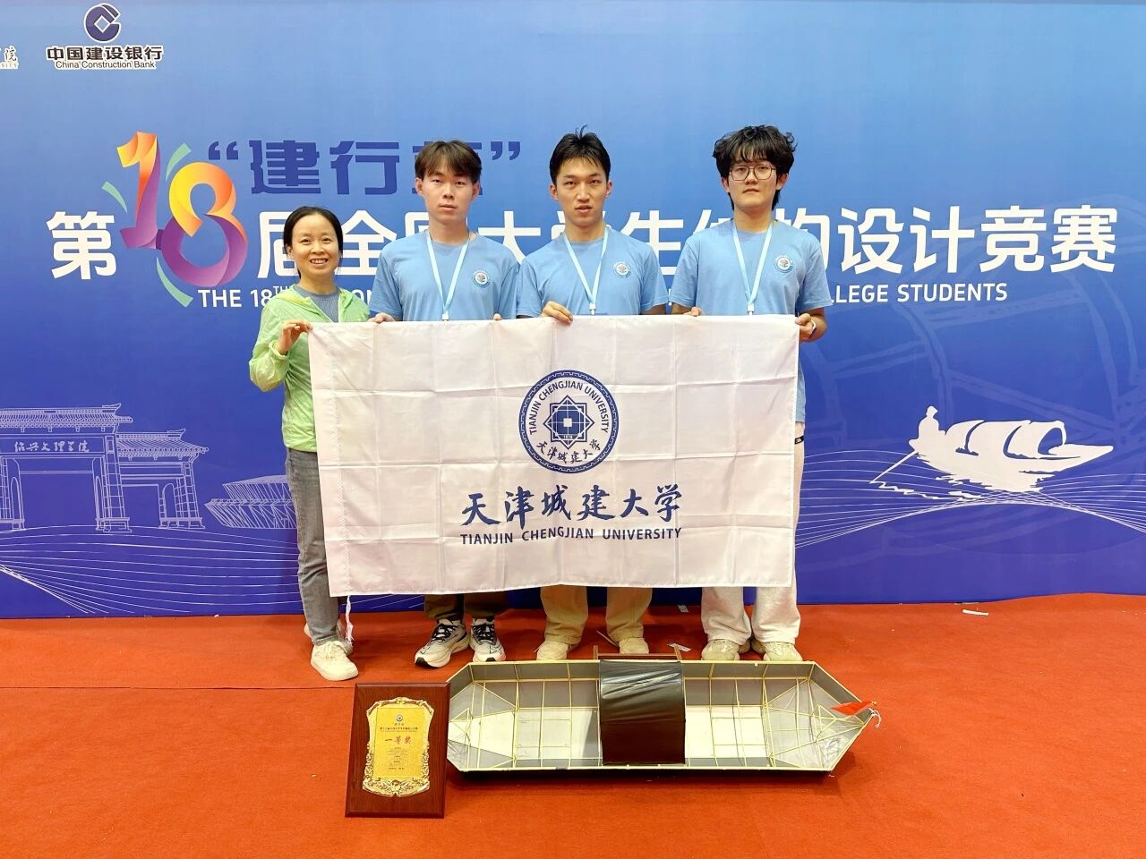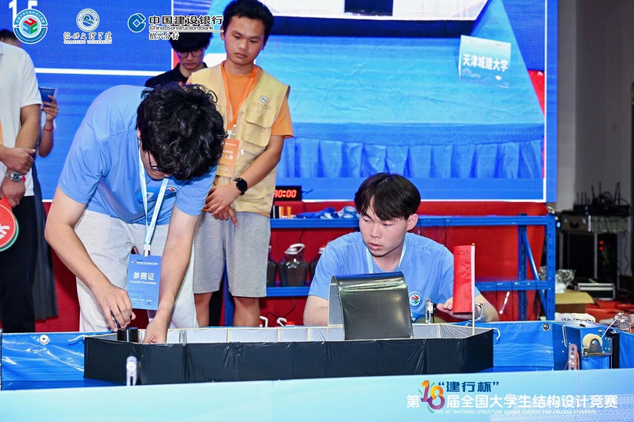 根据前期理论验证、计算、设计,历经15小时的现场模型制作环节,我校学生团队成功打造出一座造型优美、构思巧妙的乌篷船结构模型。该模型采用框架结构体系,内部创新性地设置了柔性船舷和在加载时可自主发生形变的自适应构件。前者产生的弹性变形可以在船体航行过程中转化为滑行动力,能缩短航行时间;后者能够在外部荷载作用下通过自身可控的形态变化,实时调节结构受力状态,从而在各种复杂加载条件下始终维持最优承载性能,最大程度地满足竞赛加载要求,展现出卓越的结构适应性与承载效率。