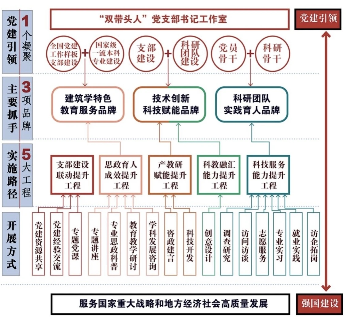 发挥高校科研优势,通过“支部建在科研团队上”的组织创新,以新型建筑工业化、城市更新、文化遗产保护、绿色建筑技术4个学科方向8个科研团队为支撑,积极服务天津城市高质量发展,为12个地方企业及企事业单位提供科技文化指导20余次,帮助企业和社区解决实际问题10项,为政府咨政建言共计10项,其中1项被纳入天津市政府“十五五”规划高校智库。