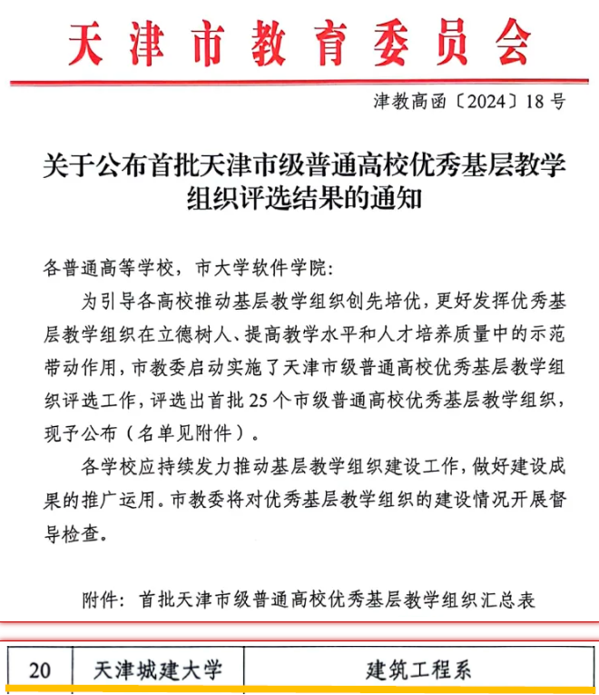 通过党建与教学的深度融合,2024年以来党支部取得了丰硕成果:建筑工程系获评天津市优秀基层教学组织,《钢结构》入选第三批国家级一流课程,《混凝土结构设计原理》和《土木工程材料A》入选第三批天津市一流课程,教师团队获得2项市级教改项目立项,支部党员何颖获“人工智能+高等教育”典型应用场景案例,支部党员周晓洁获天津市三八红旗手。这些成绩充分展现了“党建+教学”建设模式的显著成效。