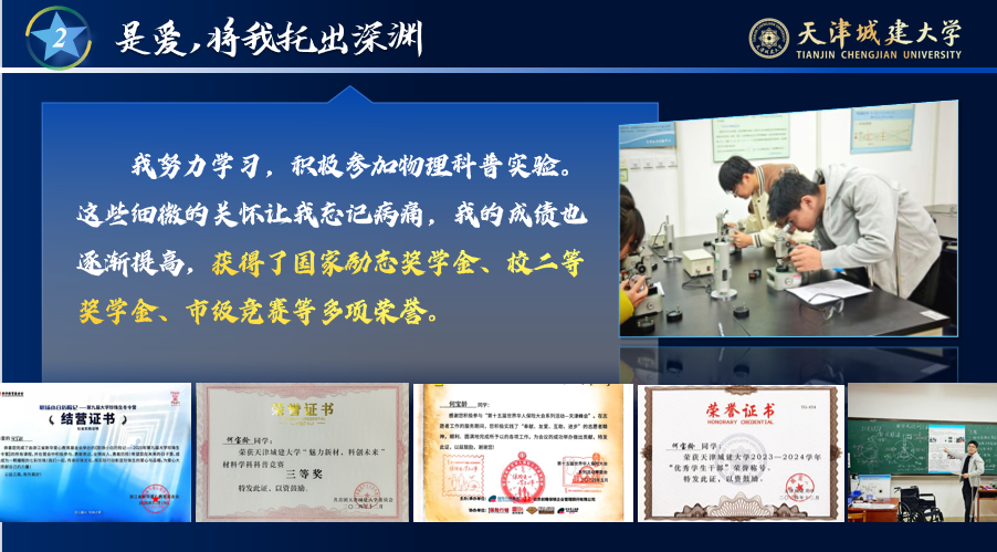 在长期治疗与亲友的陪伴鼓励下,他的病情逐渐有了起色,即使无法像常人一样奔跑,他仍选择用坚强与快乐拥抱生活。凭借不懈努力,他先后获得了国家励志奖学金、市级竞赛奖和校级二等奖学金等多项荣誉,用实际行动诠释了“逆境自强”的真正含义。