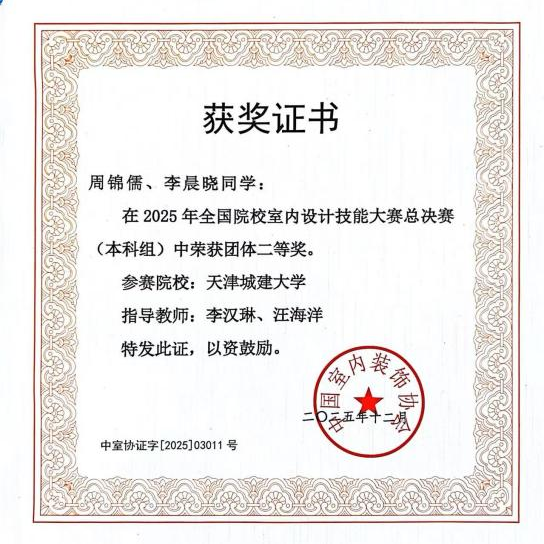 近日,2025年全国院校室内设计技能大赛国赛总决赛在上海落下帷幕。我校建筑学院学生周锦儒、李晨晓在指导教师李汉琳、汪海洋的指导下,凭借扎实的专业功底与出色的现场发挥,荣获全国总决赛二等奖。