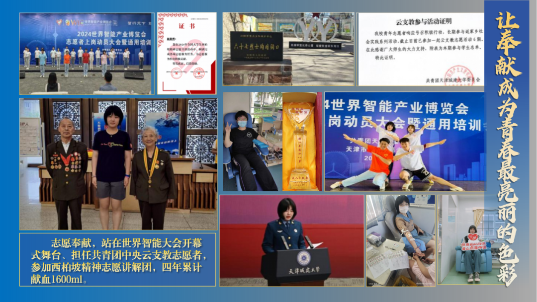她曾斩获全国大学生讲思政课二等奖、全国大学生统计建模大赛三等奖等荣誉50余项;身为乒乓球二级运动员、裁判员,在各类体育赛事中屡获佳绩;在志愿服务的舞台上,她同样绽放光彩——曾亮相世界智能大会开幕式,也担任过共青团中央“云支教”志愿者,以行动诠释奉献,让青春绽放出最亮丽的色彩。