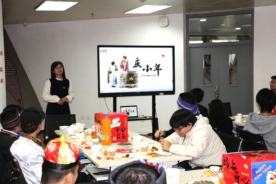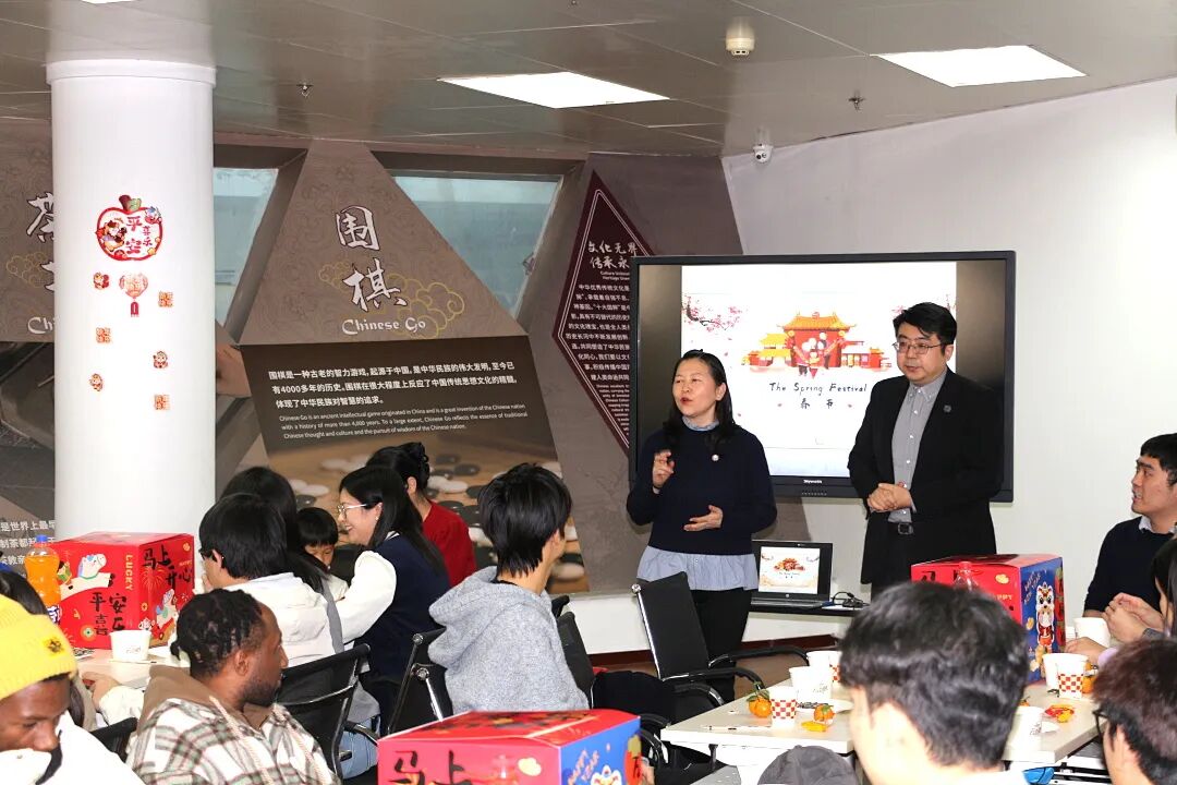 随后,活动进入了富有中国文化特色的环节。汉语言教师王佳乐为在场师生带来了一次生动有趣的“中国年俗文化小课堂”,她详细介绍了中国传统新年的贴春联、发压岁钱、包饺子、放鞭炮等习俗,深入浅出地展示了中华优秀传统文化的魅力,使中外学生对中华传统文化有了更为深刻的认识。
