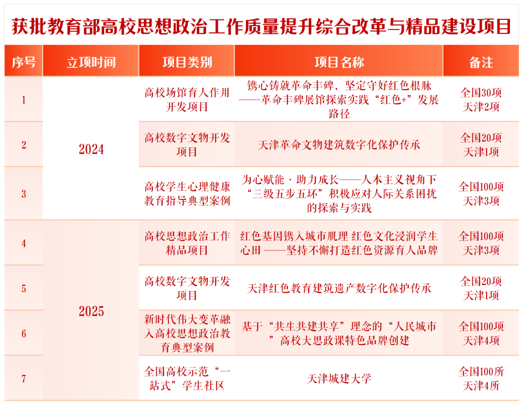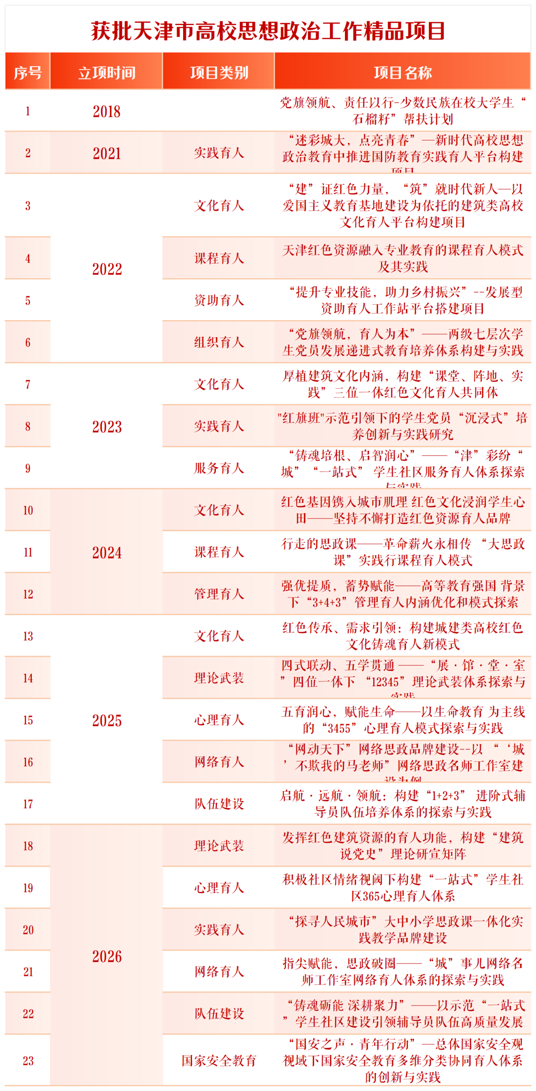 近年来,学校党委聚焦落实立德树人根本任务,系统谋划思想政治教育工作,坚持守正创新、精耕细作,深入推动“三全育人”改革创新,持续深化思政教育内涵建设,强化思政品牌培育。深挖天津红色建筑资源,依托革命丰碑展馆、红色文化遗产研究院,实施红色文化浸润工程,打造红色文化铸魂育人“金字”品牌,多措并举提升思政引领力,全面推进思政工作提质增效,推动了学校思想政治工作改革创新不断走向深入。