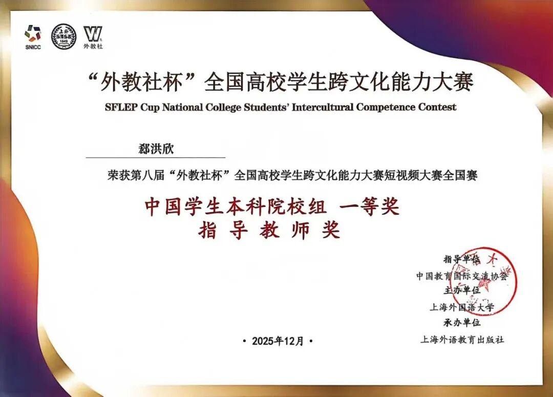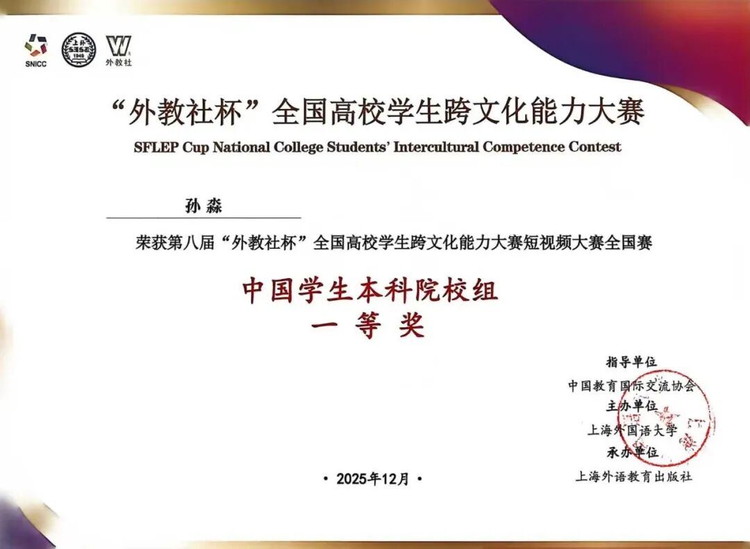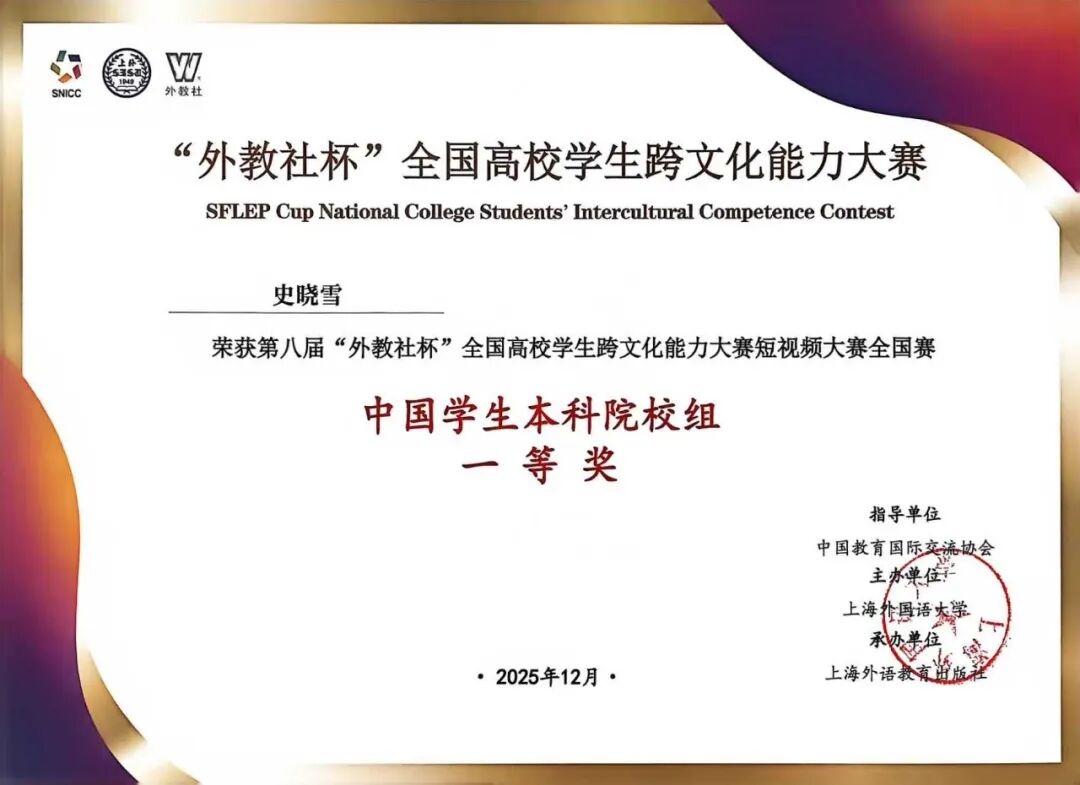 近日,2025 年 “外研社・国才杯”“理解当代中国” 全国大学生外语能力大赛、第八届“外教社杯”全国高校学生跨文化能力大赛圆满落幕,我校学子在两项外语类高水平赛事中接连取得突破。