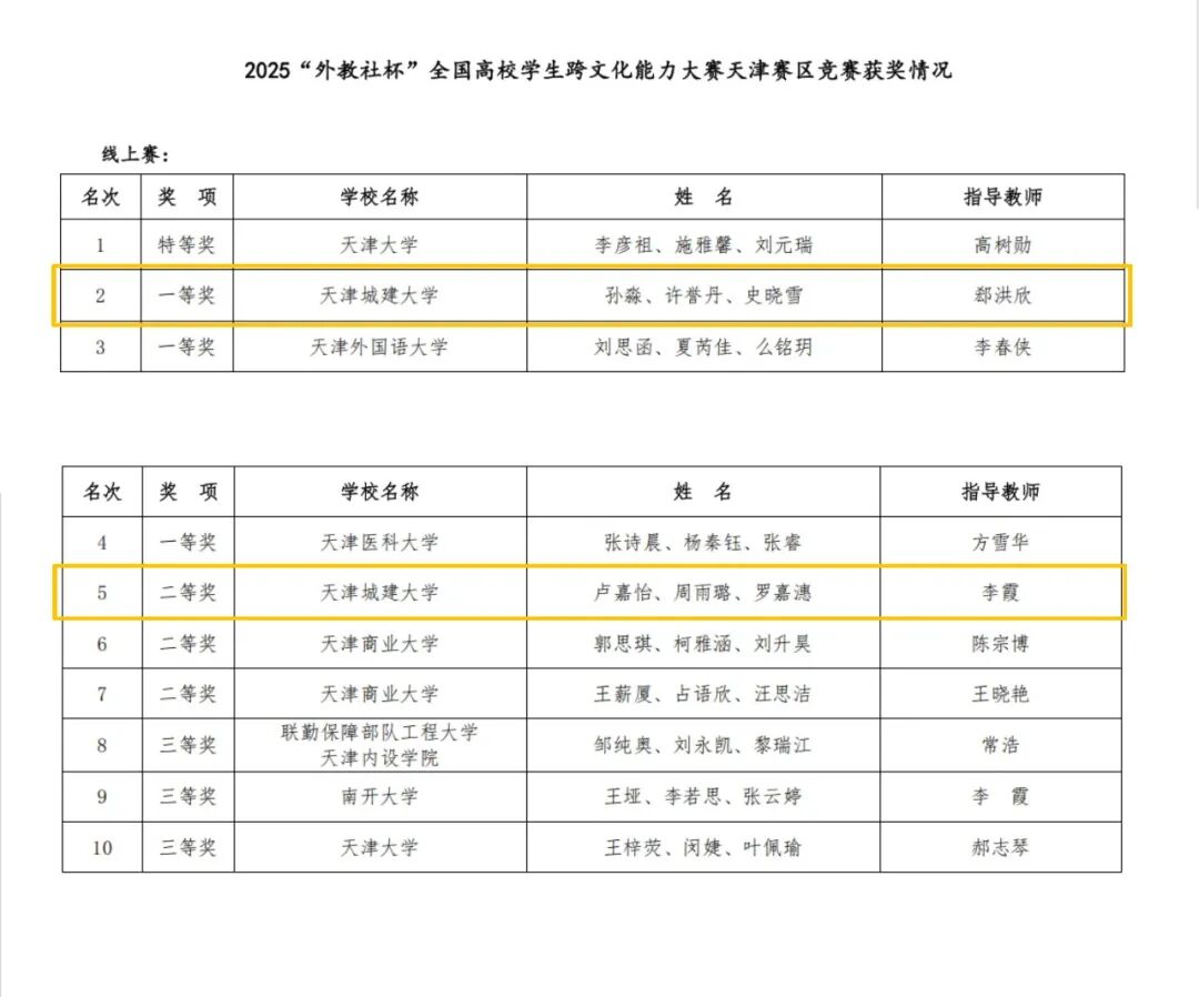 外国语学院学生孙淼、许誉丹、史晓雪的作品《A Bowl of Noodles,A Taste of China—一碗面里的中国》获“外教社杯”全国高校学生跨文化能力大赛视频赛国家级一等奖;外国语学院学生卢嘉怡、土木工程学院学生周雨璐、国际教育学院学生罗嘉潓的作品《Bridging East to West—桥贯东西》获“外教社杯”全国高校学生跨文化能力大赛视频赛市级二等奖。