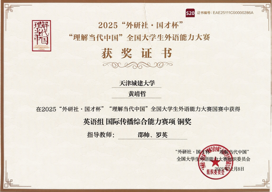 外国语学院学生黄靖哲获“外研社・国才杯”“理解当代中国” 全国大学生外语能力大赛笔译赛项市级三等奖、综合能力赛项国家级铜奖。