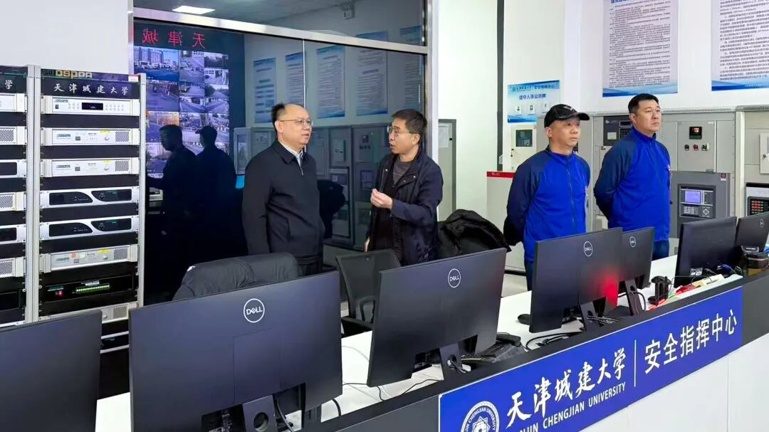 校领导一行在安防监控中心,通过监控大屏实时调阅了校门、主干道、教学楼、实验室、学生公寓等重点区域的安防画面,听取了安工部关于开学季校园安全整体安排、校园安防设施运维、重点区域24小时巡查值守以及应急处置准备、演练的相关情况。