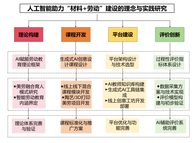 张磊教授主持的“人工智能助力‘材料+劳动’建设的理念与实践研究”项目,针对材料类专业劳动教育存在教学内容与产业前沿脱节、美育与劳育割裂、评价方式单一固化等现实困境,遵循“理念引领、课程承载、平台支撑、评价保障”的整体思路,秉持“AI赋能、劳动融入、专业融合、美育浸润”的研究理念,系统性开展人工智能技术与材料专业特色劳动教育深度融合研究。研究旨在推进“人工智能—材料专业—劳动教育—美育熏陶”四维多元融合的教学创新改革,构建“线上创意工坊+AI导师+线下实体劳动”的混合式教学平台,探索生成式AI在材料类专业“美劳协同育人”中的具体实施路径,推动劳动教育理念从以体力劳动和技能传授为主导,向“脑体并举、创新驱动、美劳互济”的智能化劳动教育模式转型。