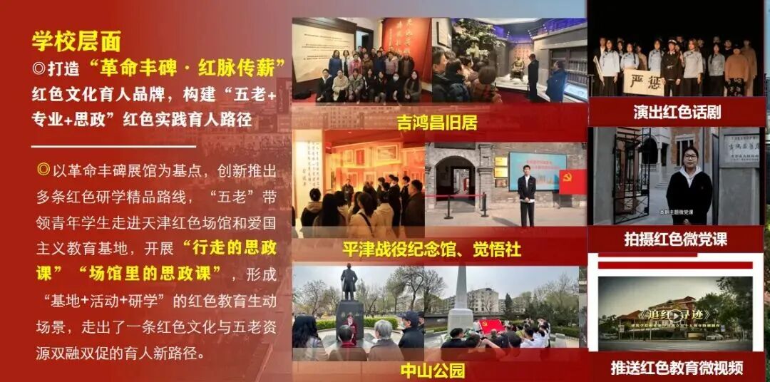 创新打造“革命丰碑·红脉传薪”红色文化育人品牌。组织退休老教师组建“银龄宣讲团”开展红色文化宣讲活动,以革命丰碑展馆为基点,推出多条红色研学精品路线;“五老”带领青年学生走进天津红色场馆和教育基地,开展“行走的思政课”,形成“基地+活动+研学”的红色教育生动场景。