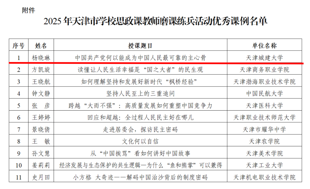 近日,由中共天津市委教育工作委员会、天津市教育委员会主办的“2025年天津市学校思政课教师磨课练兵活动”优秀课例评选结果正式揭晓。我校马克思主义学院杨晓琳老师主讲的《中国共产党何以能成为中国人民最可靠的主心骨》一课,凭借扎实的教学功底与极具感染力的课堂呈现,从全市众多参评课例中脱颖而出,成功获评“2025年天津市学校思政课教师磨课练兵活动优秀课例”。
