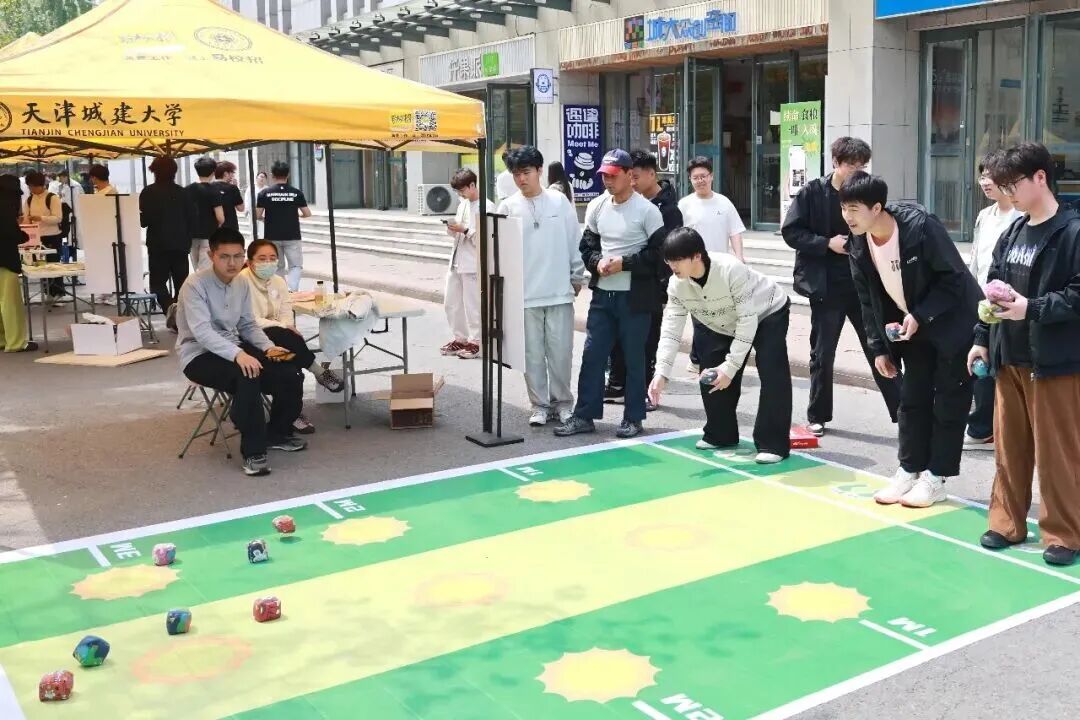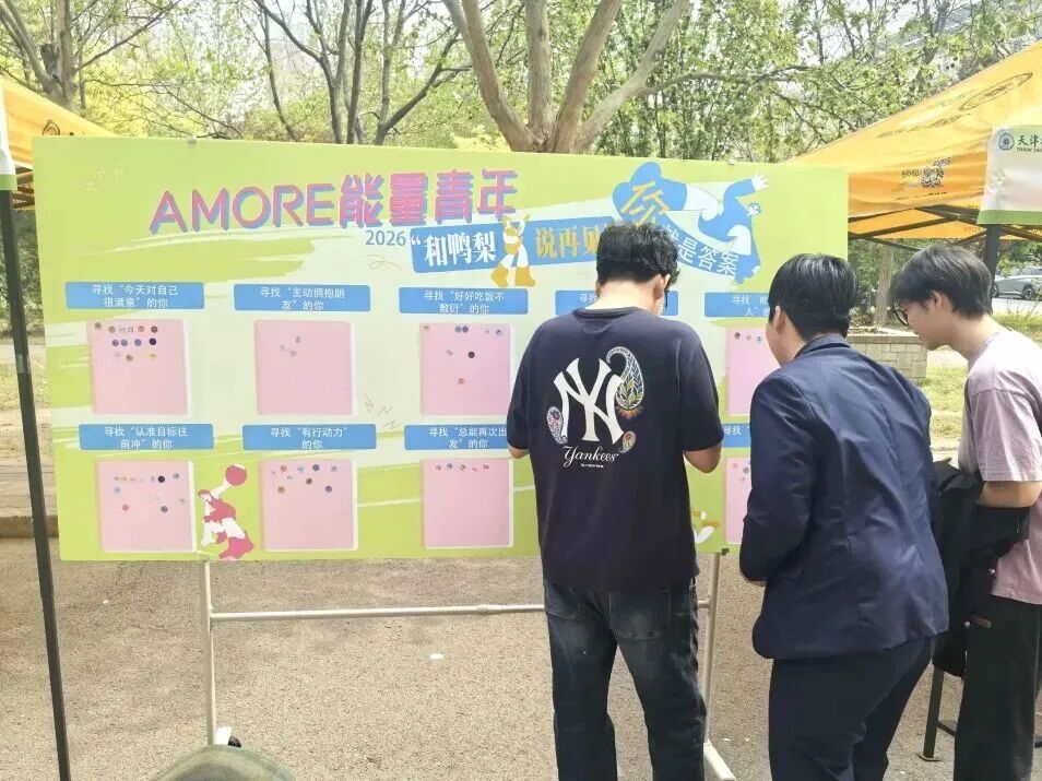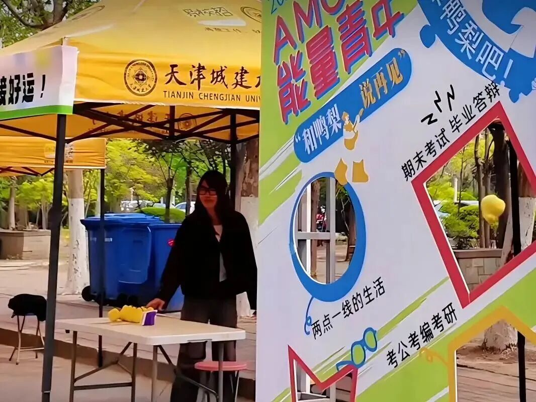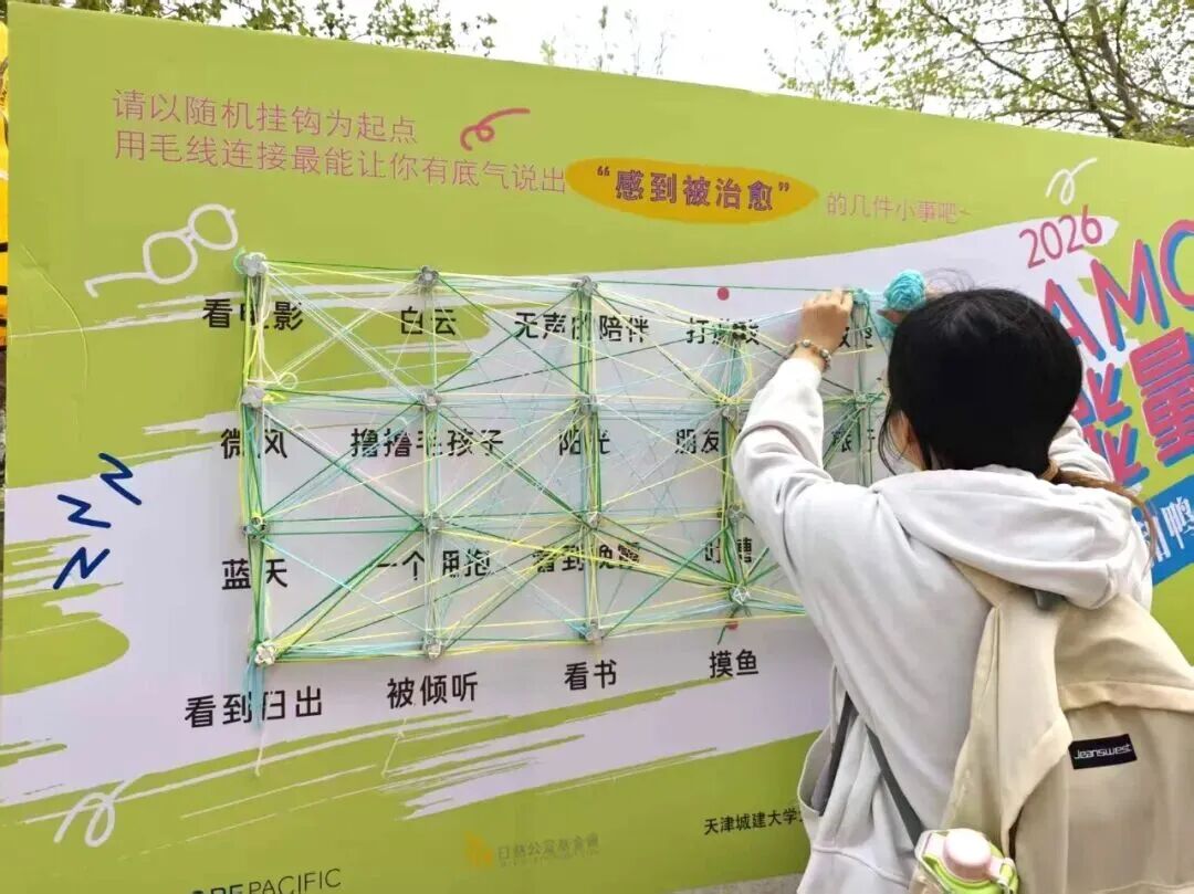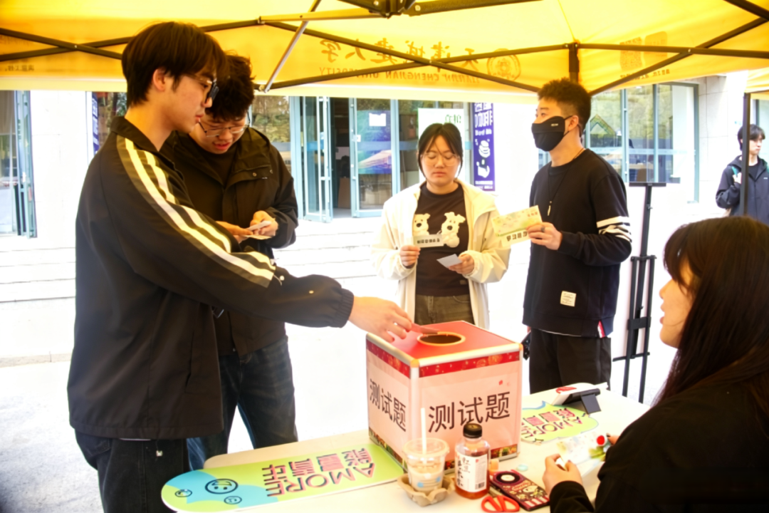 户外同步开展的能量青年主题心灵路演,设置了“砸砸鸭梨,接好运”“独一无二,你就是答案”“毛线减压”及心理健康科普区等四个趣味站点。通过轻量化、互动性强的心理小游戏,引导学生在轻松氛围中表达情绪、释放压力。同学们在活动中放松身心,沉浸在愉悦的能量补给之中。